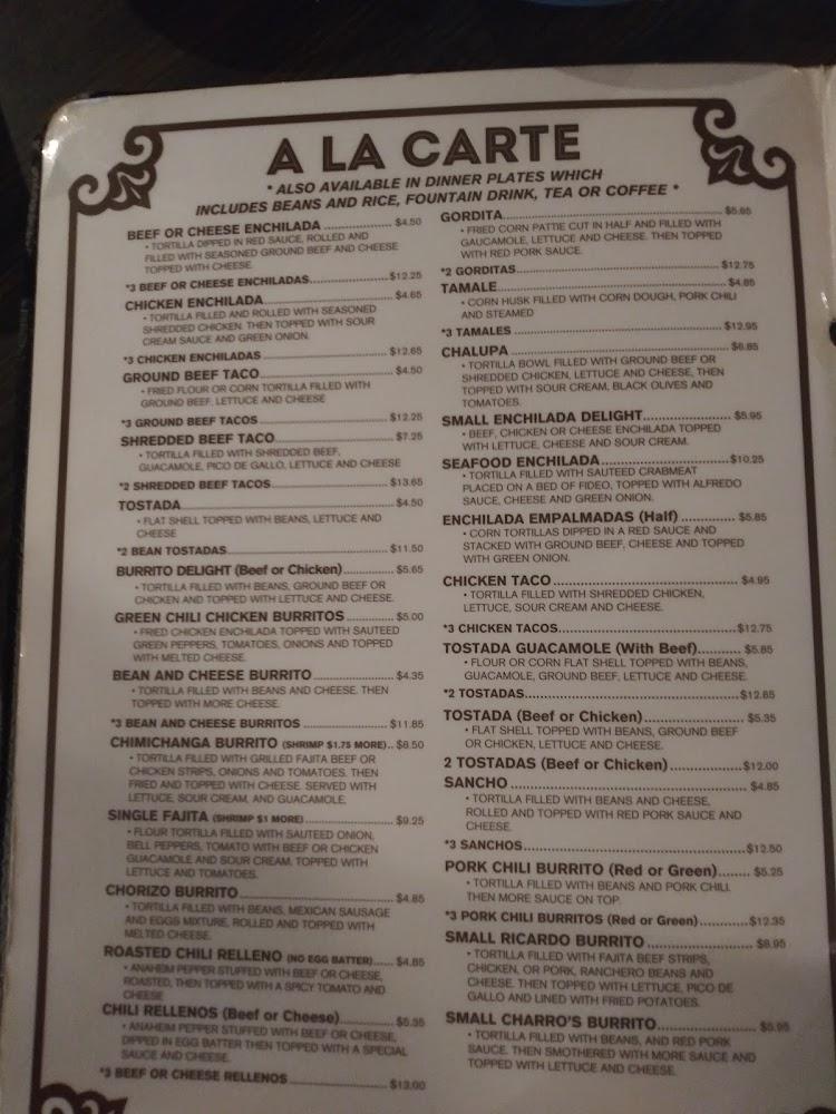 El Charro offers a diverse menu, featuring 26 items, including beef or cheese enchiladas, tacos, and burritos. The dishes are prepared with fresh ingredients, ensuring authentic flavors. Signature items include the combo enchilada plate and Ricardo's Burrito. The menu also caters to kids, making it family-friendly. Enjoy tasty beverages alongside hearty meals for a well-rounded dining experience.